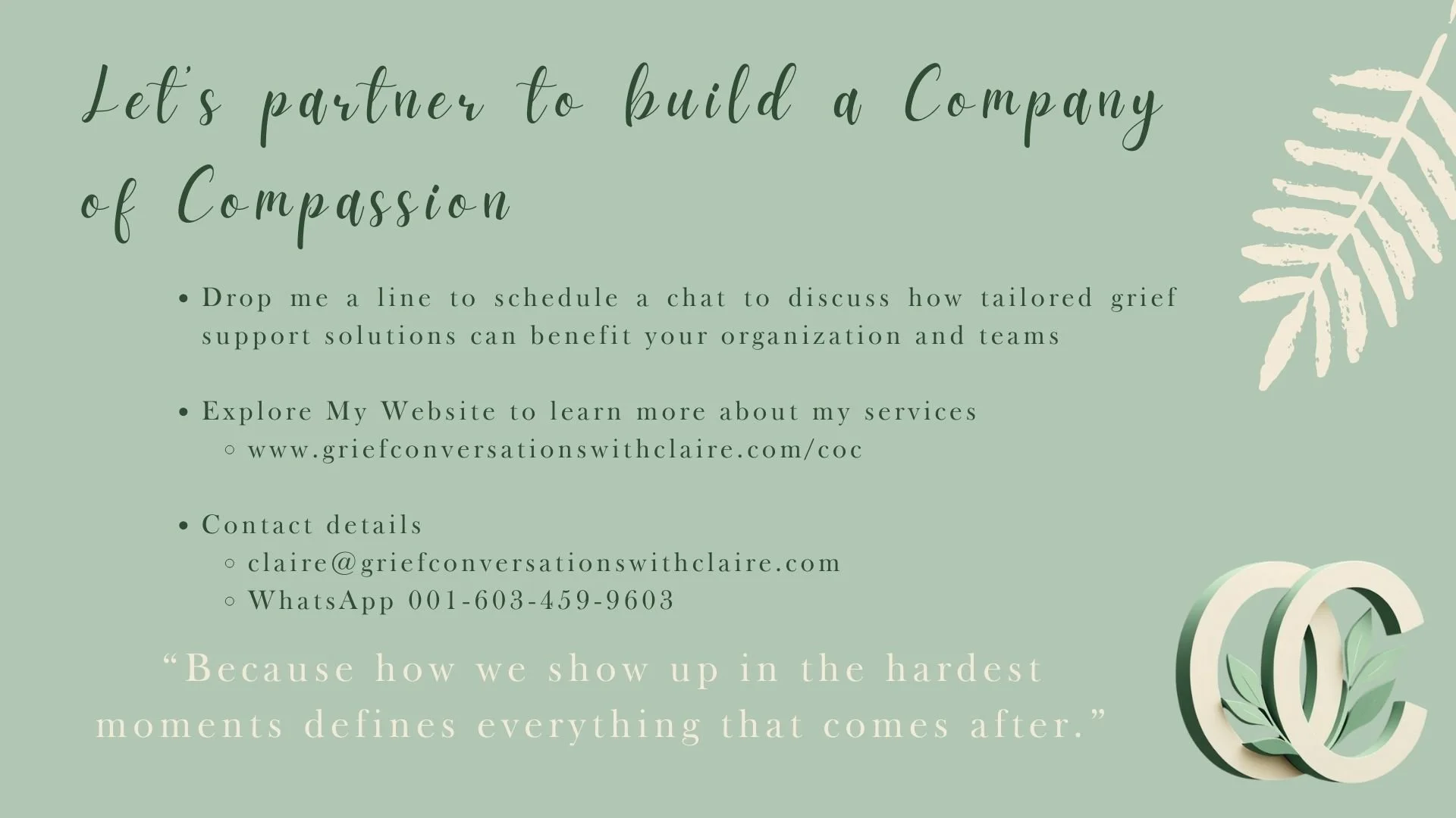 I partner with organizations to understand their current grief response, delivering a strategic roadmap with new grief responses and policies that enhance psychological safety and support during profound life changes.