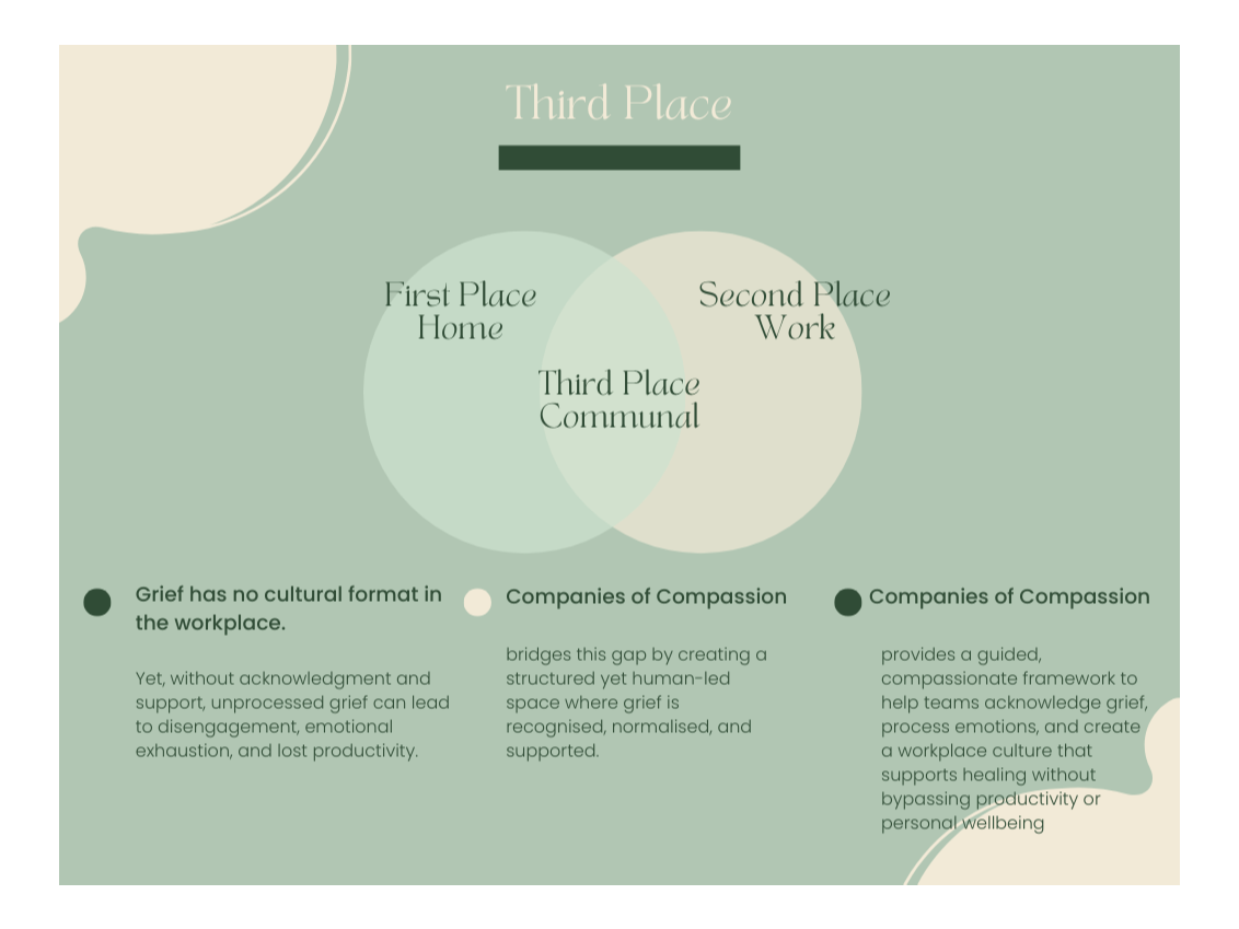 The Third Place Theory (Sociologist Ray Oldenburg) suggests that while home is our First Place and work is our Second Place, we need a Third Place, a communal space for connection , conversation, and emotional processing. Yet, workplaces often lack a cultural space for grief, a structured way to support employees navigating loss.
